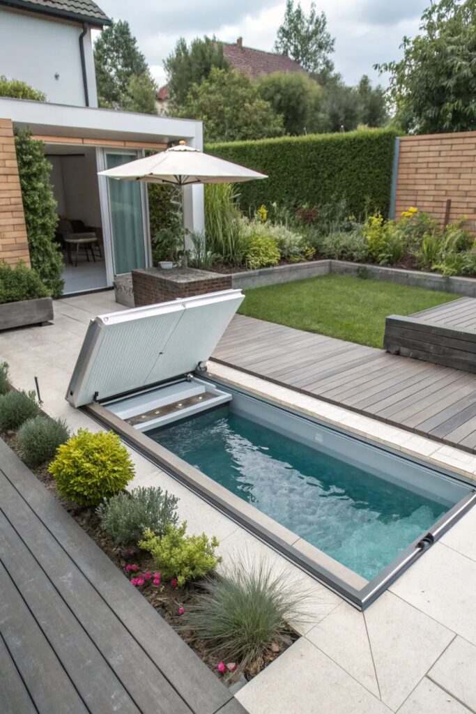 Piscina moderna integrada al patio con sistema oculto y cubierta automática. El diseño minimalista combina madera, jardín ordenado y líneas limpias, creando un espacio funcional y elegante que se transforma en segundos sin perder armonía ni estilo contemporáneo.
