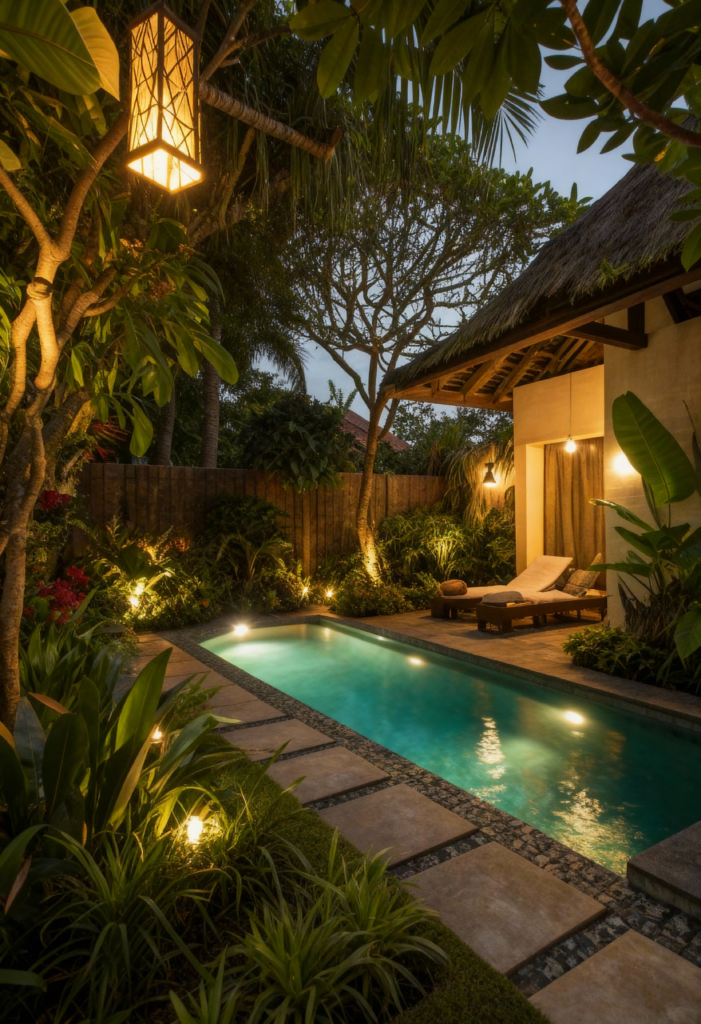 Piscina rectangular rodeada de exuberante vegetación tropical, iluminada con luces cálidas al atardecer. El diseño íntimo combina piedra natural, senderos discretos y una atmósfera relajante, creando un refugio perfecto para descansar, desconectarse del ruido y disfrutar noches serenas.