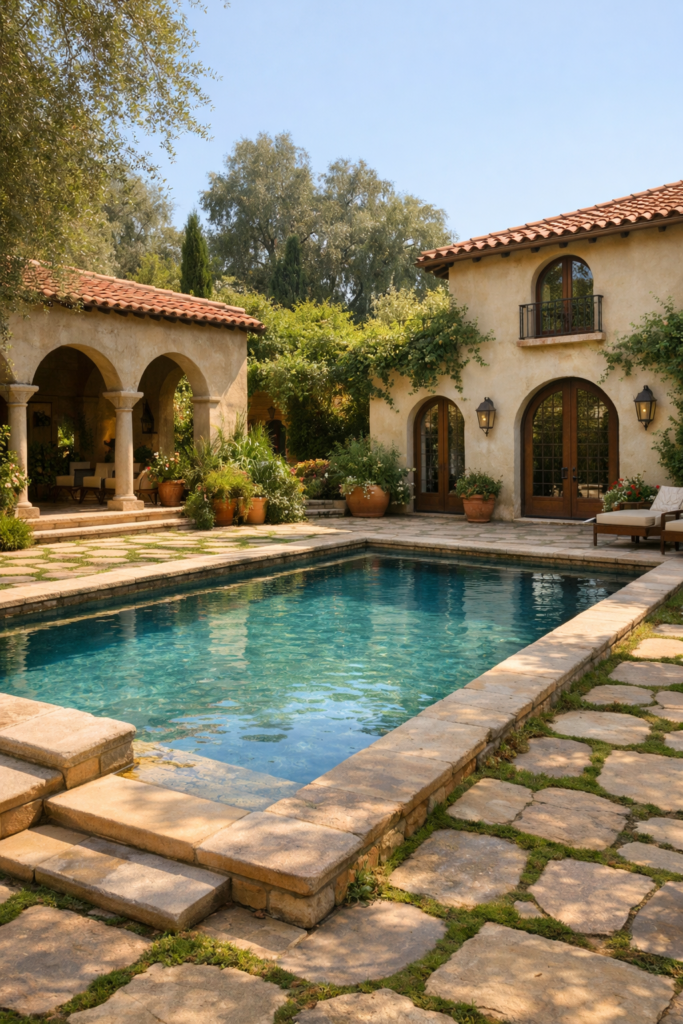 Elegante patio con piscina rectangular rodeada de arquitectura mediterránea, arcos clásicos y macetas de barro. La combinación de piedra, agua cristalina y vegetación crea un espacio acogedor, ideal para tardes tranquilas, reuniones familiares y una vida pausada al aire libre.