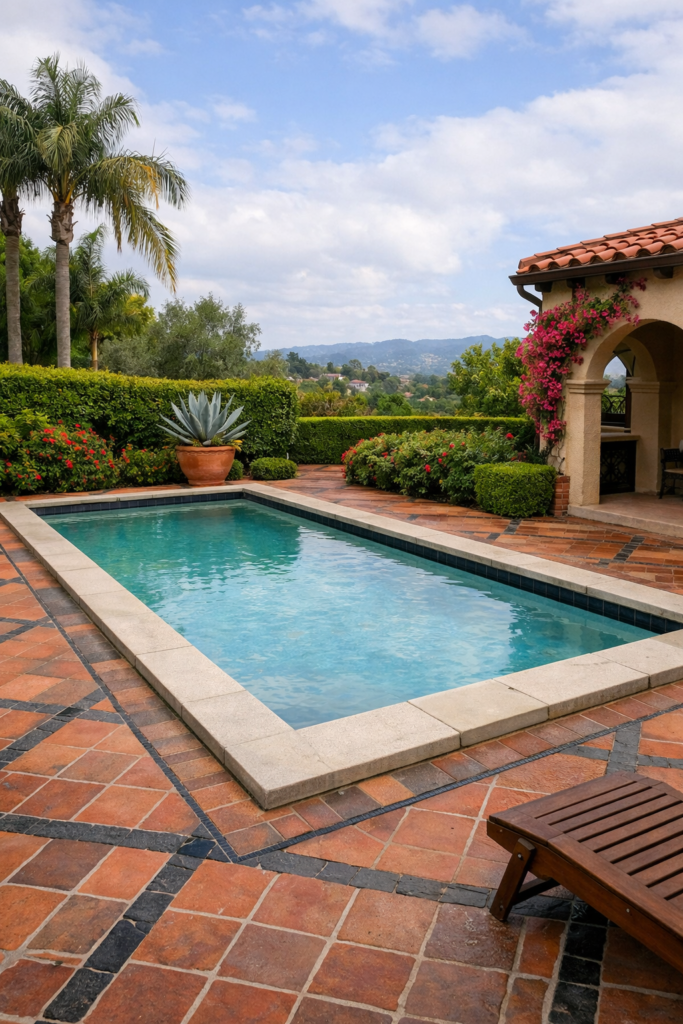 Piscina rectangular enmarcada por pisos de terracota y jardines cuidados, con vistas abiertas al paisaje. El entorno combina diseño clásico, colores cálidos y naturaleza viva, transmitiendo equilibrio, frescura y una sensación permanente de hogar confortable.