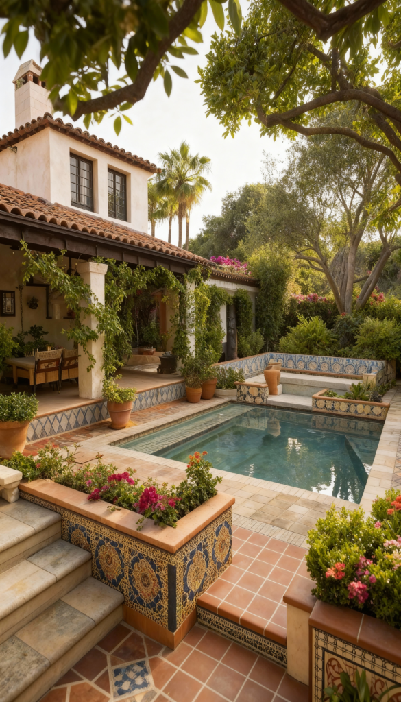 Patio interior con piscina decorada en cerámica tradicional, rodeada de plantas, columnas y detalles artesanales. Cada elemento transmite historia, calidez y armonía, creando un espacio íntimo donde el agua y la arquitectura dialogan con belleza atemporal.