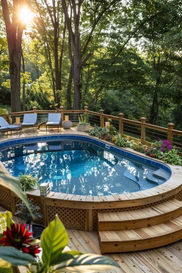 Piscina elevada de diseño rodeada de madera natural y bosque frondoso. El agua refleja la luz del atardecer creando un ambiente cálido, íntimo y relajante. Ideal para desconectar, disfrutar la naturaleza y convertir el patio en un refugio de descanso.