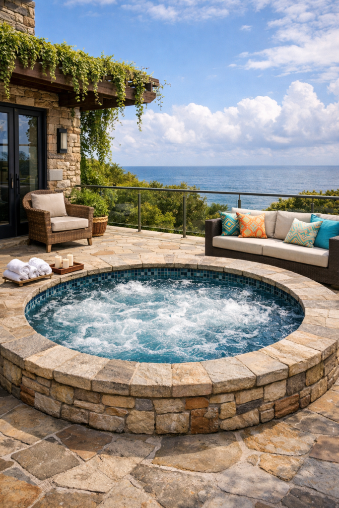 Jacuzzi circular de piedra natural con agua burbujeante y vista directa al océano. El diseño elegante, acompañado de muebles confortables y tonos cálidos, invita al relax total, combinando lujo, naturaleza y bienestar en un solo espacio exterior.