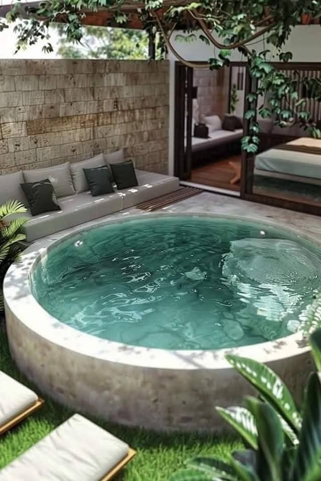 Jacuzzi circular de obra rodeado de sillones, plantas y arquitectura cálida. El espacio invita al descanso profundo, combinando agua, comodidad y diseño natural para crear un ambiente íntimo perfecto para disfrutar cualquier momento del día.