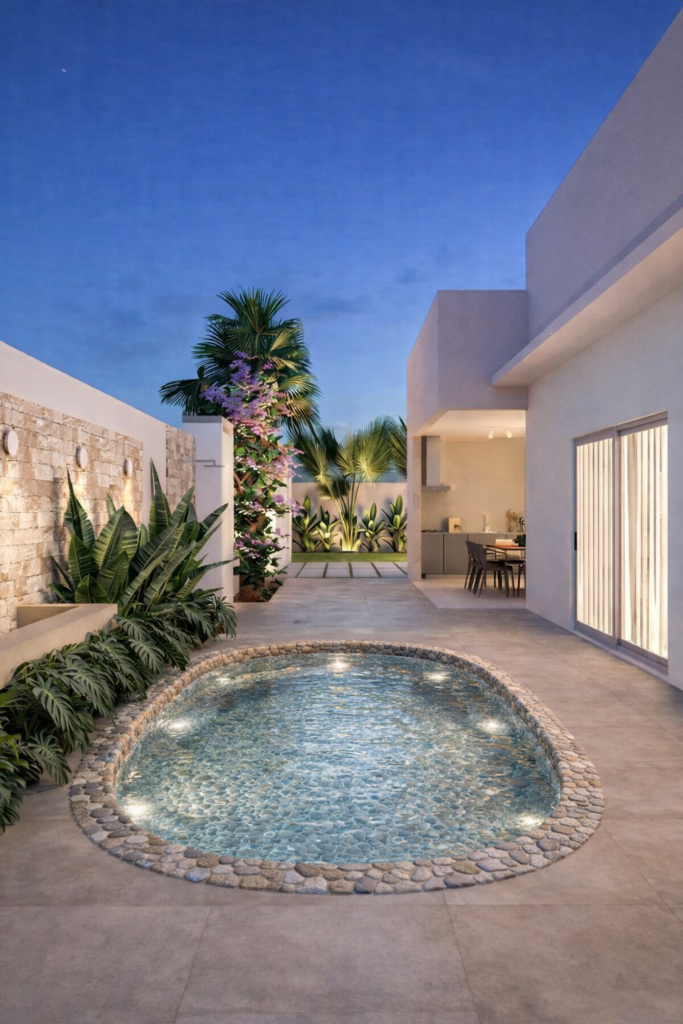 Piscina circular iluminada al anochecer, rodeada de muros claros, vegetación tropical y luces suaves. El ambiente transmite calma absoluta, convirtiendo el patio en un espacio elegante, íntimo y perfecto para desconectar al final del día.