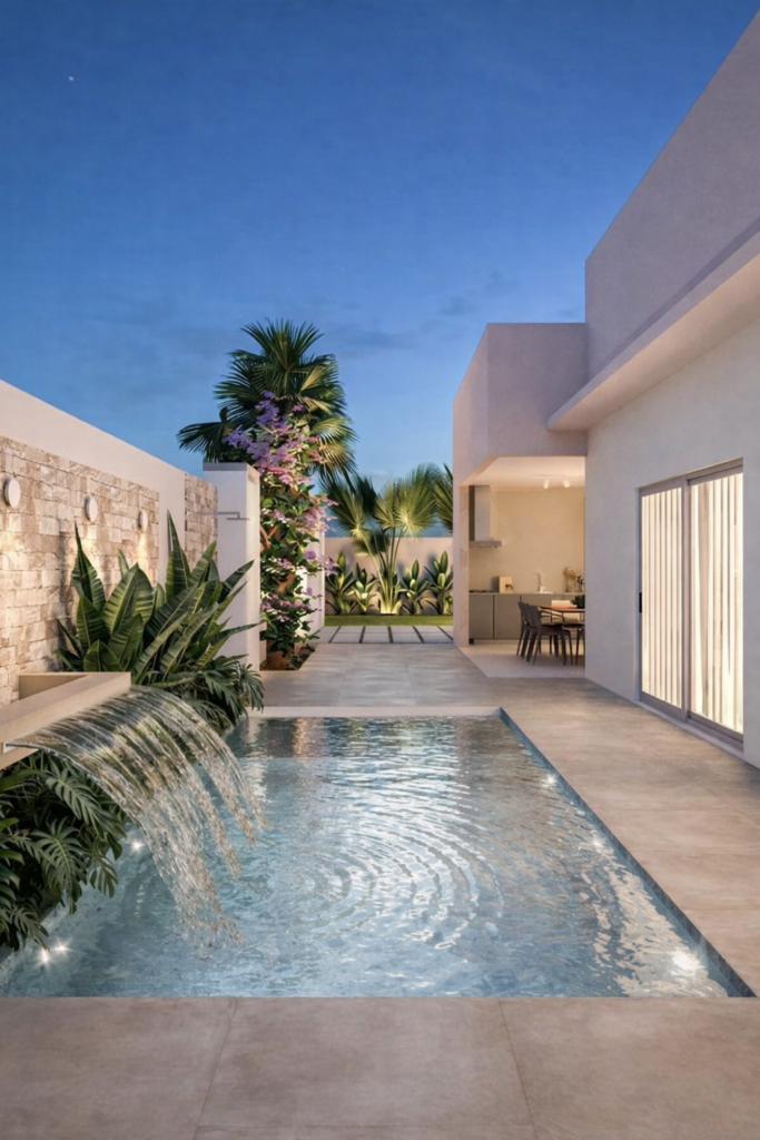 Piscina rectangular con cascada integrada y diseño contemporáneo, rodeada de plantas decorativas y arquitectura minimalista. El movimiento del agua, la iluminación y los materiales neutros crean un entorno sofisticado, ideal para relajarse con estilo.